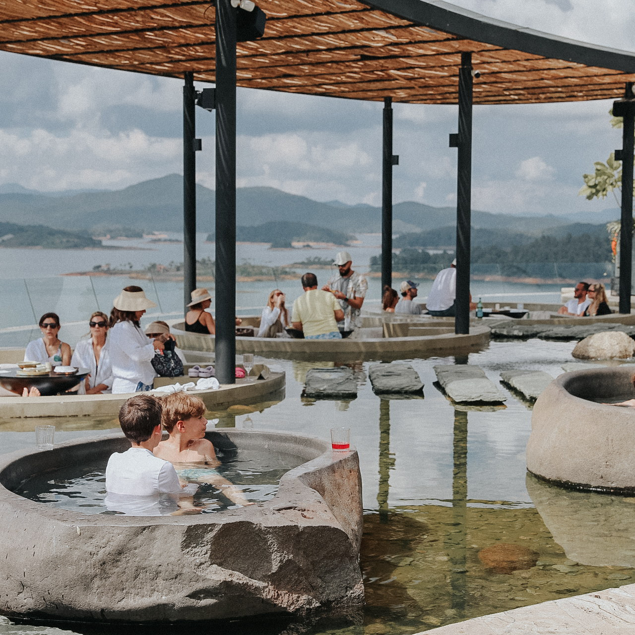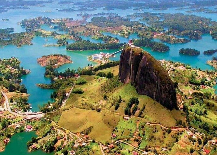 Guatapé donde el paisaje se vuelve postal. Su gran protagonista es la Piedra del Peñol, que se eleva sobre el embalse y regala una de las vistas más espectaculares de Antioquia. Un panorama inmenso de agua, islas verdes y montañas que parecen pintadas a mano.